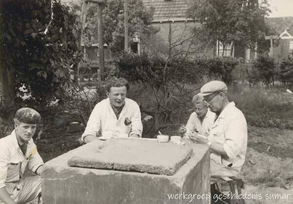 F03142 Schilders pauzeren. Tweede van links: Marten Holwerda.