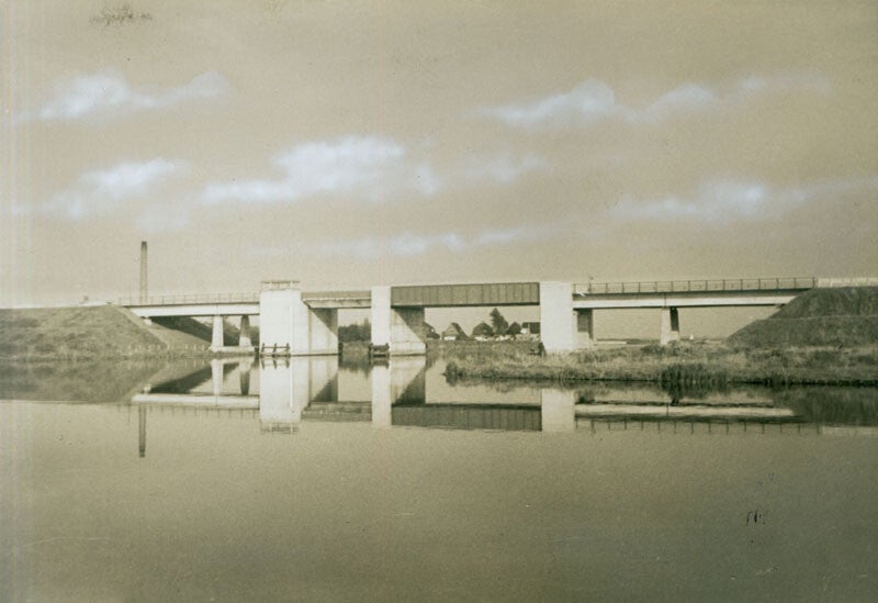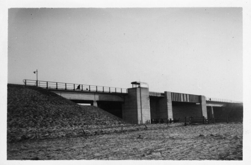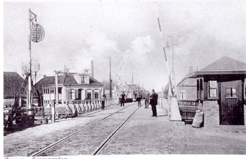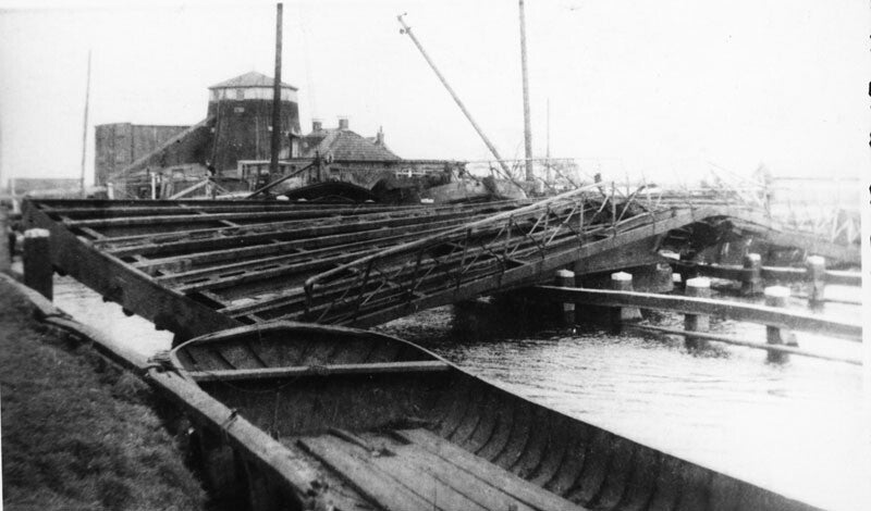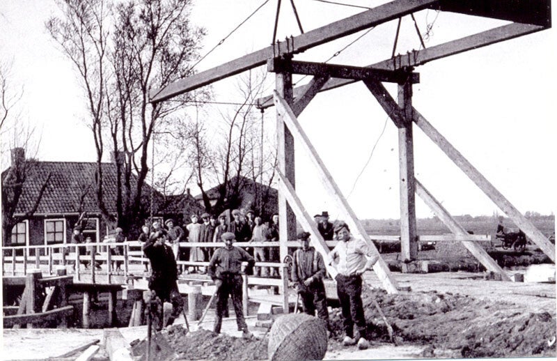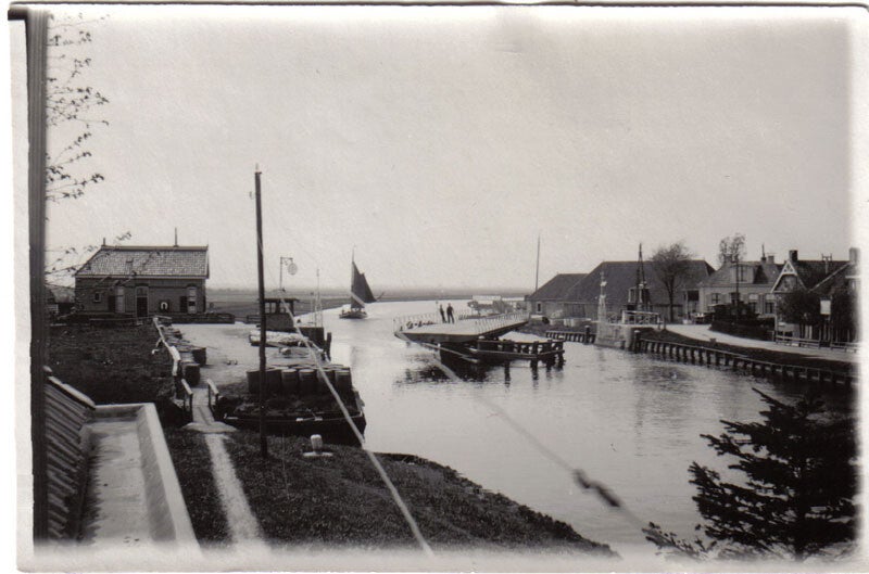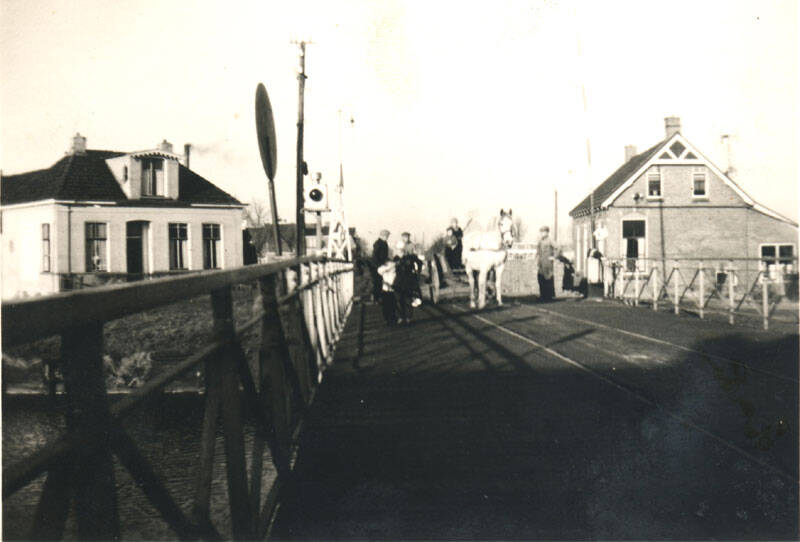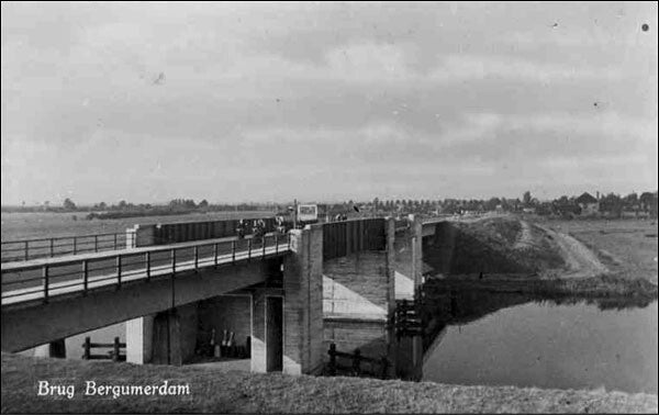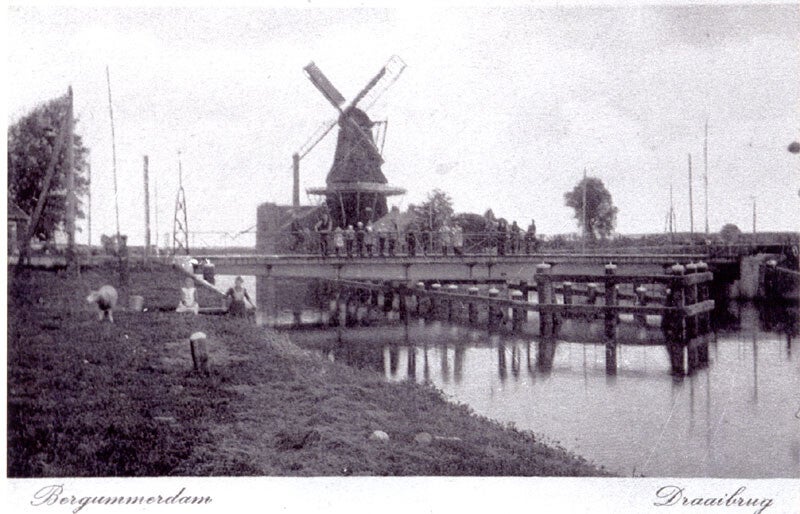 Brug Bergumerdam. Links witte molenaarswoning.