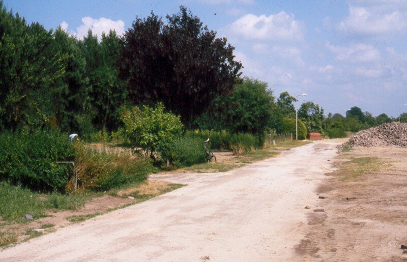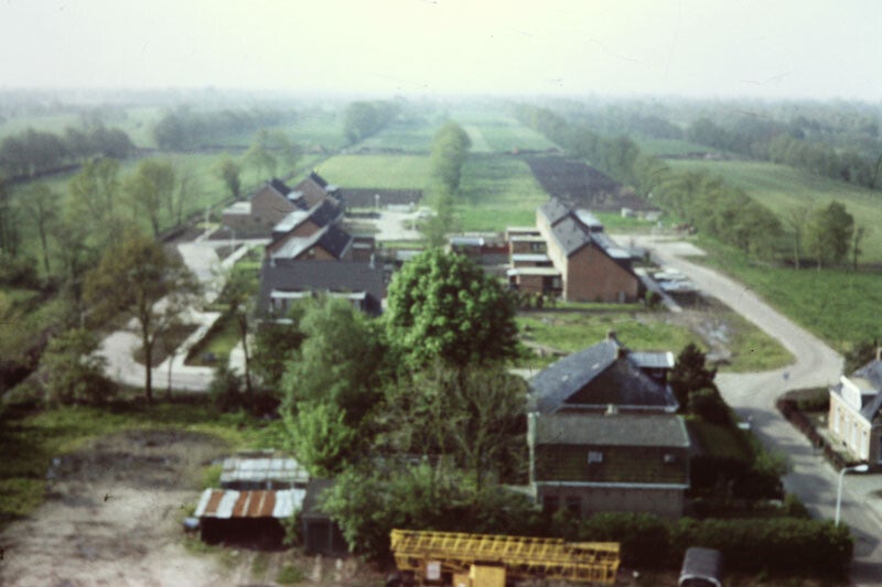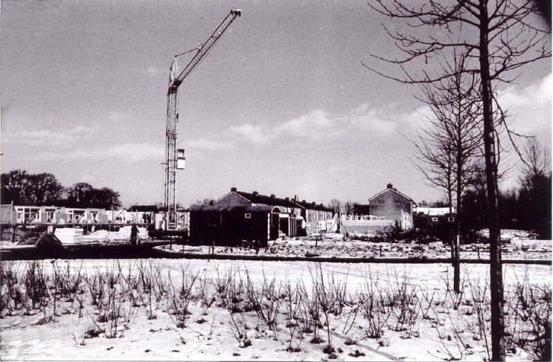 Rechts bij de bouwkranen de woningen van de Ds. Noordmansstraat in aanbouw. Links de S.P. Hoekstraweg.