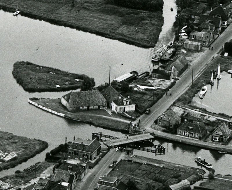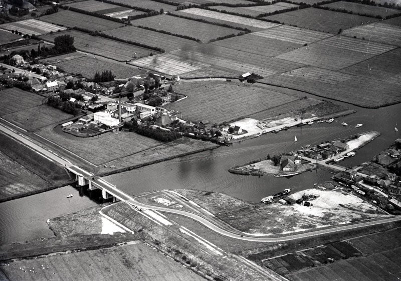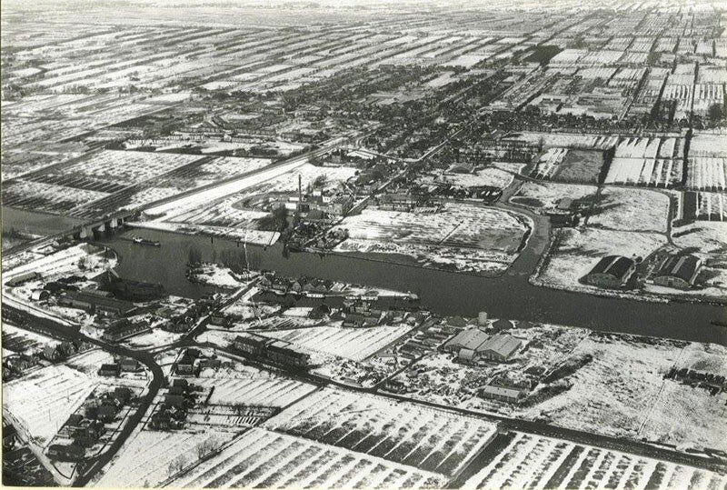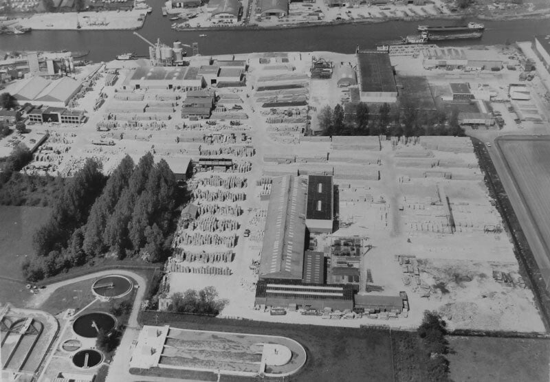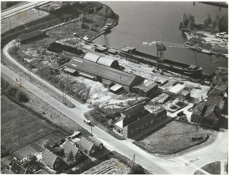 ▲ F03483LFN-luchtfoto van Noppert Beton in de beginjaren, Bergumerdam. Tegenwoordig locatie Provinciale Waterstaat.